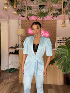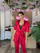 Questo Cordinato Romantic è l'ideale per un look romantico e femminile. Il pantalone elasticizzato a zampa si adatta perfettamente al corpo e la giacca, dotata di cintura inclusa, garantisce una vestibilità dalla XS alla L. Aggiungi un tocco di eleganza e comodità al tuo outfit con questo cordinato. Altezza modella 170cm.