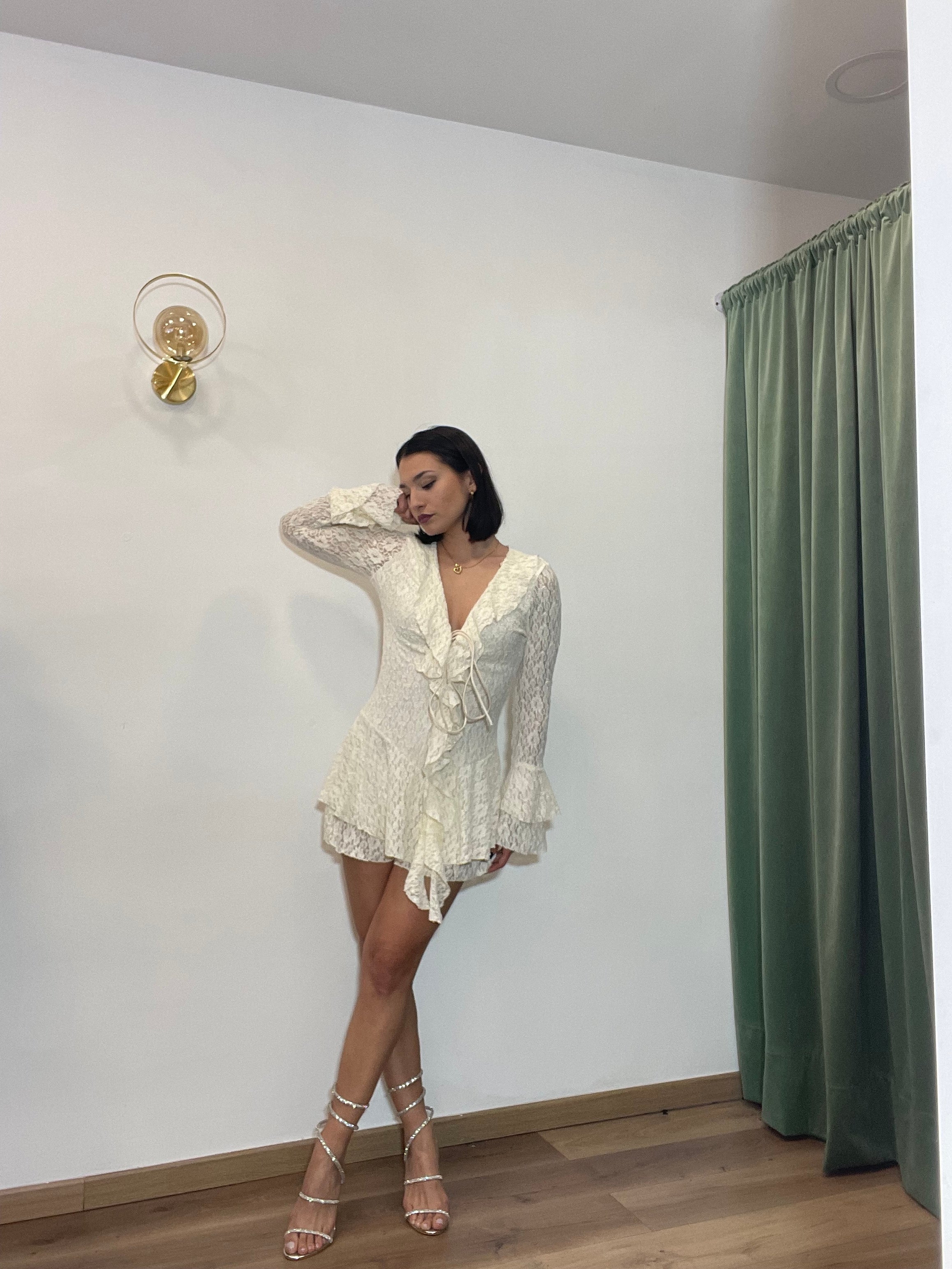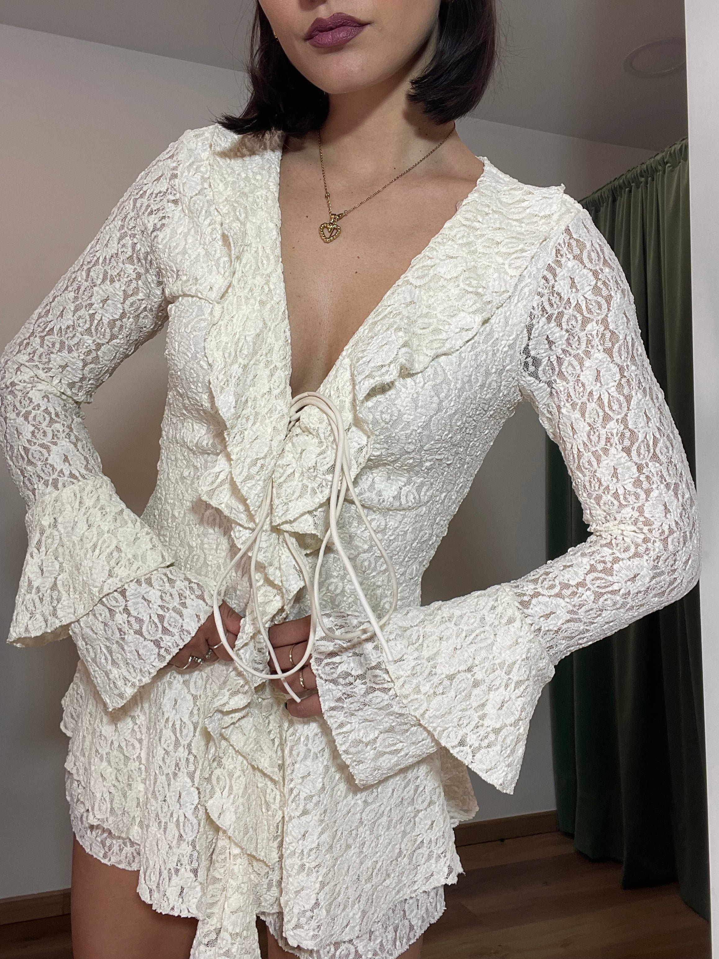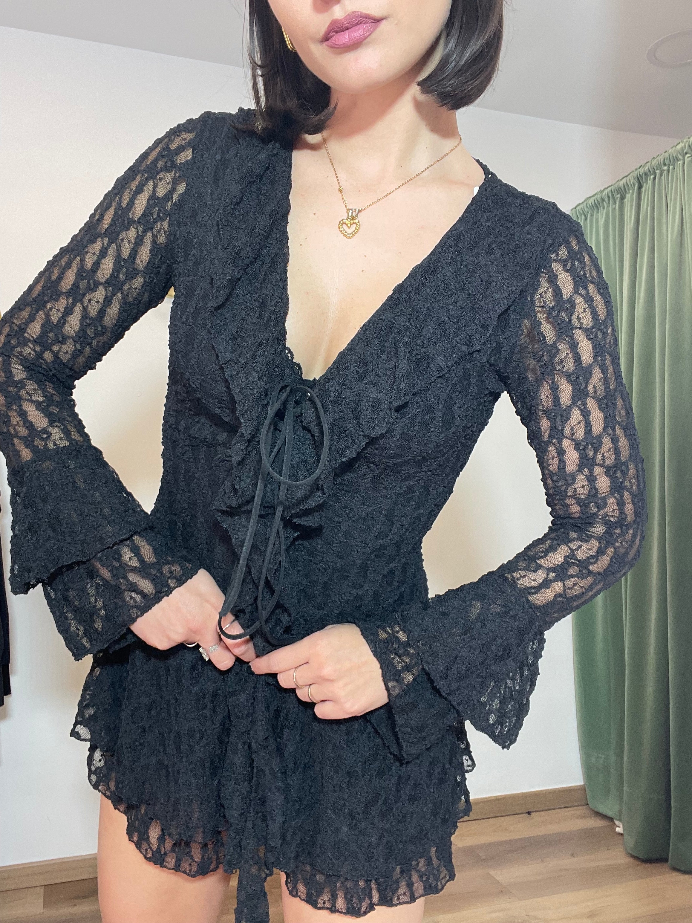 La tutina Clichè è realizzata in pizzo super elasticizzato, garantendo una vestibilità versatile per taglie dalla XS alla L. Questo materiale offre comfort e libertà di movimento, adattandosi perfettamente alla silhouette del corpo. Ideale per occasioni che richiedono un abbigliamento elegante e sofisticato.