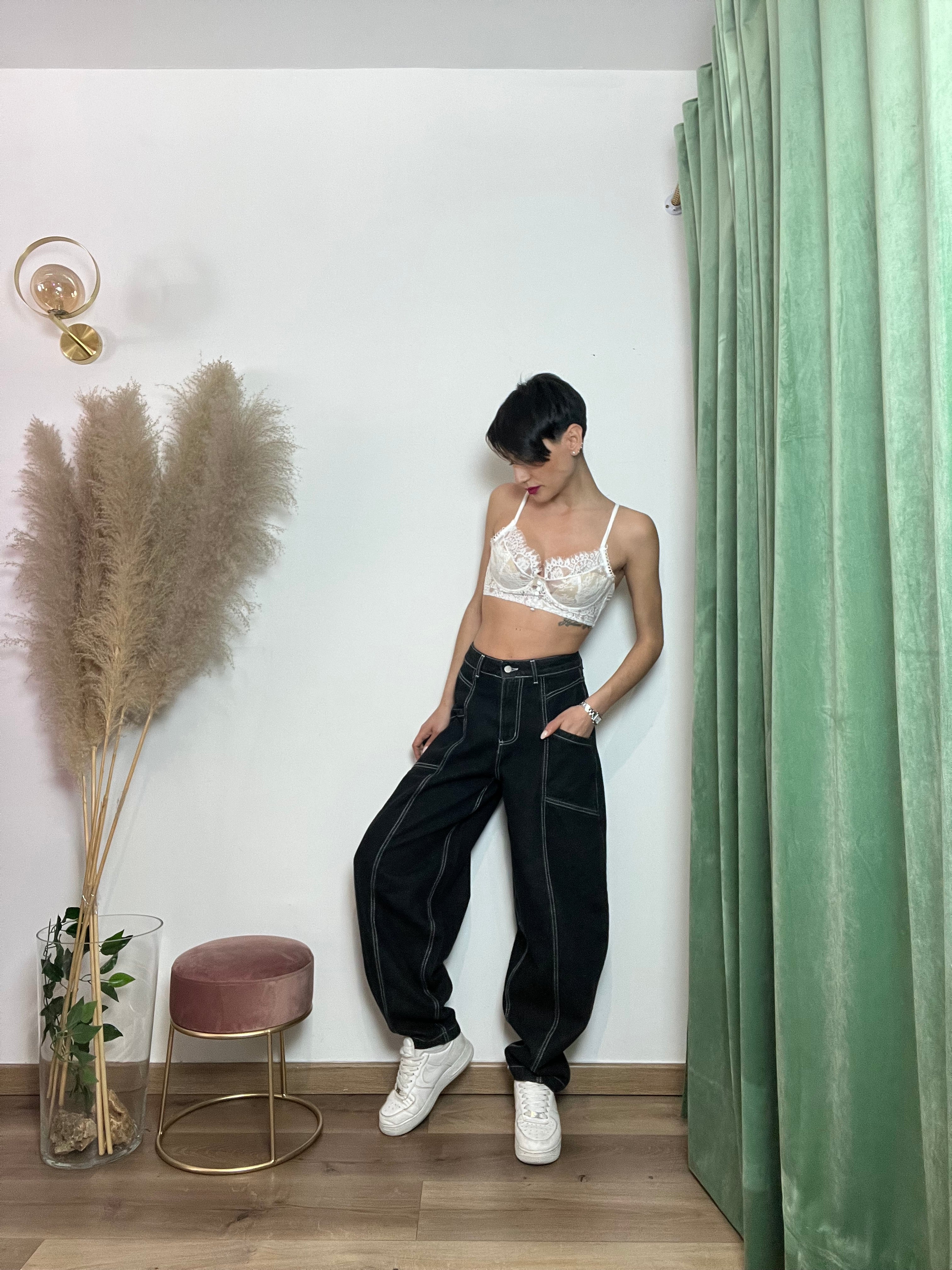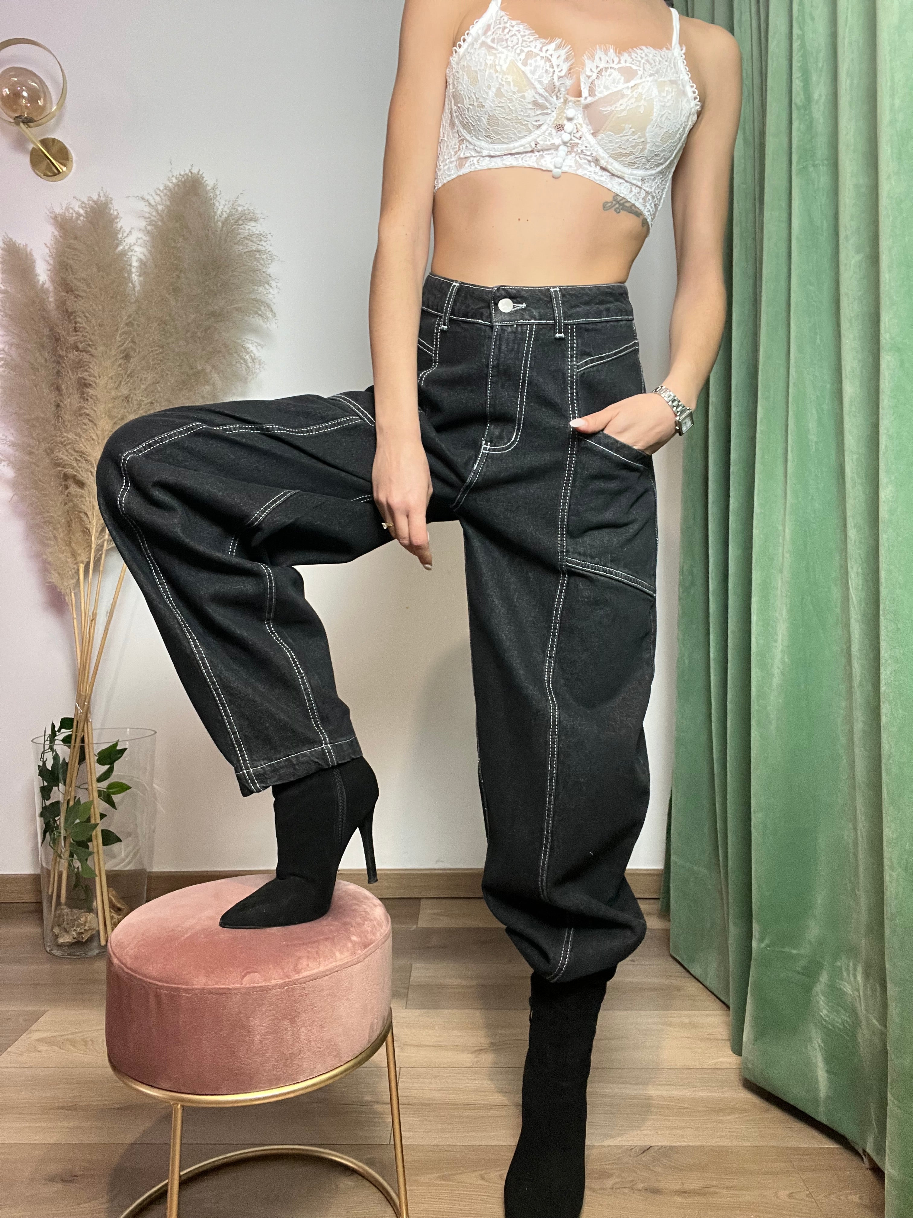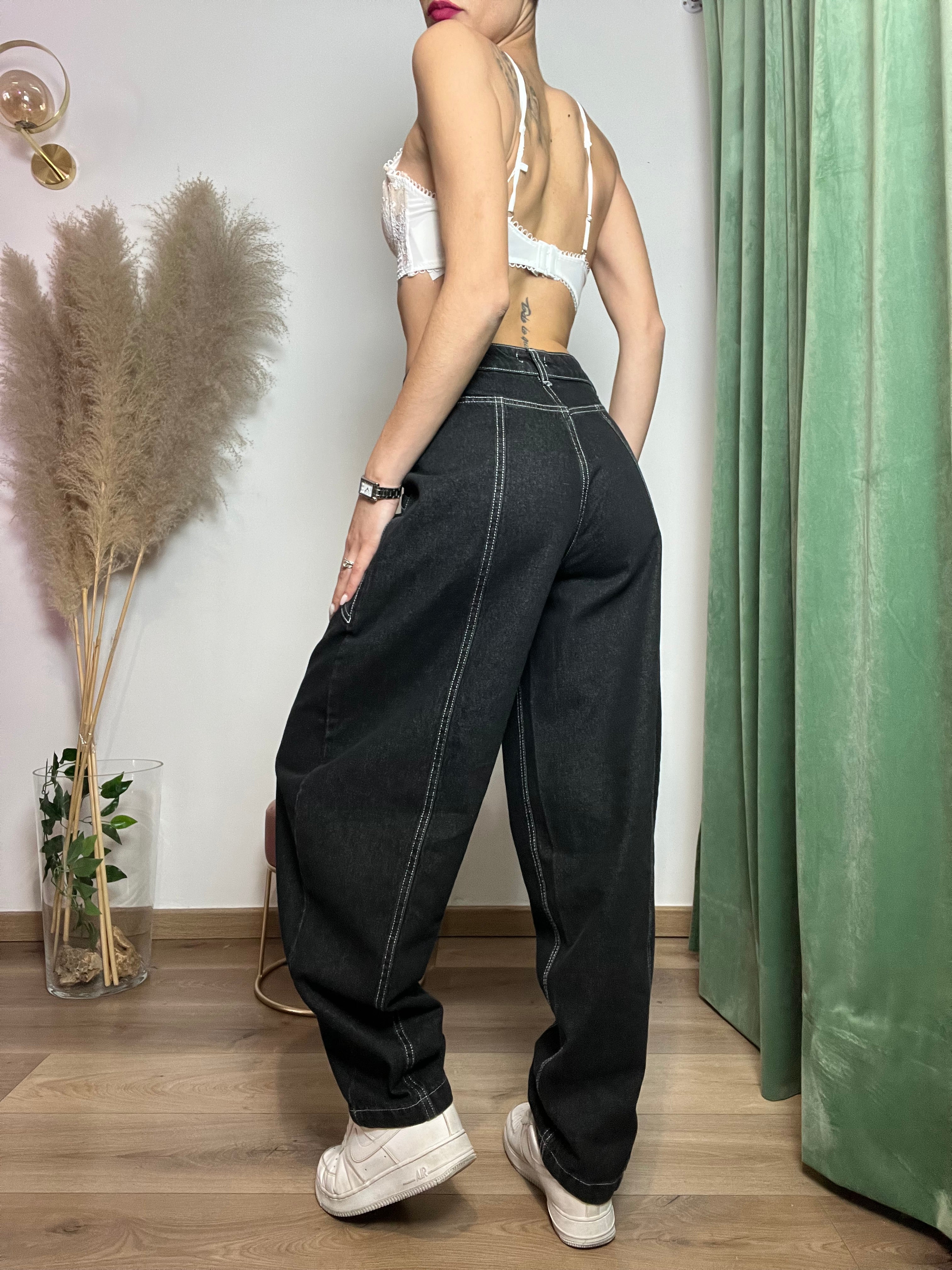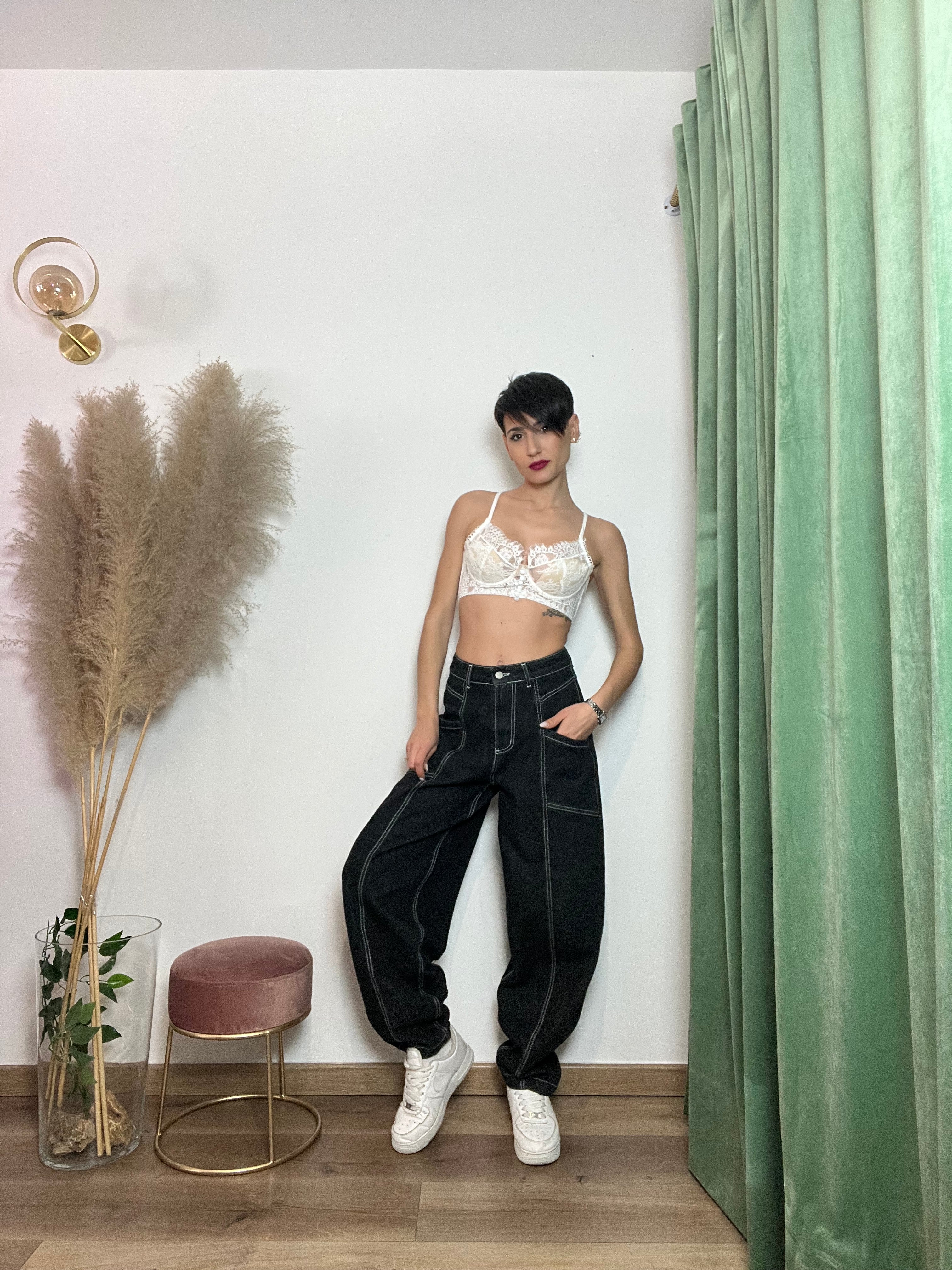 Esalta la tua silhouette con i nostri jeans modello baloon. Le cuciture bianche aggiungono un tocco di unicità, mentre la comoda vestibilità ti farà sentire a tuo agio in ogni momento. Scegli la tua taglia.