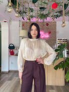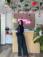 Pantalone vita alta a palazzo taglia unica con elastico sul retro veste dalla XS alla M. Altezza modella 170cm.