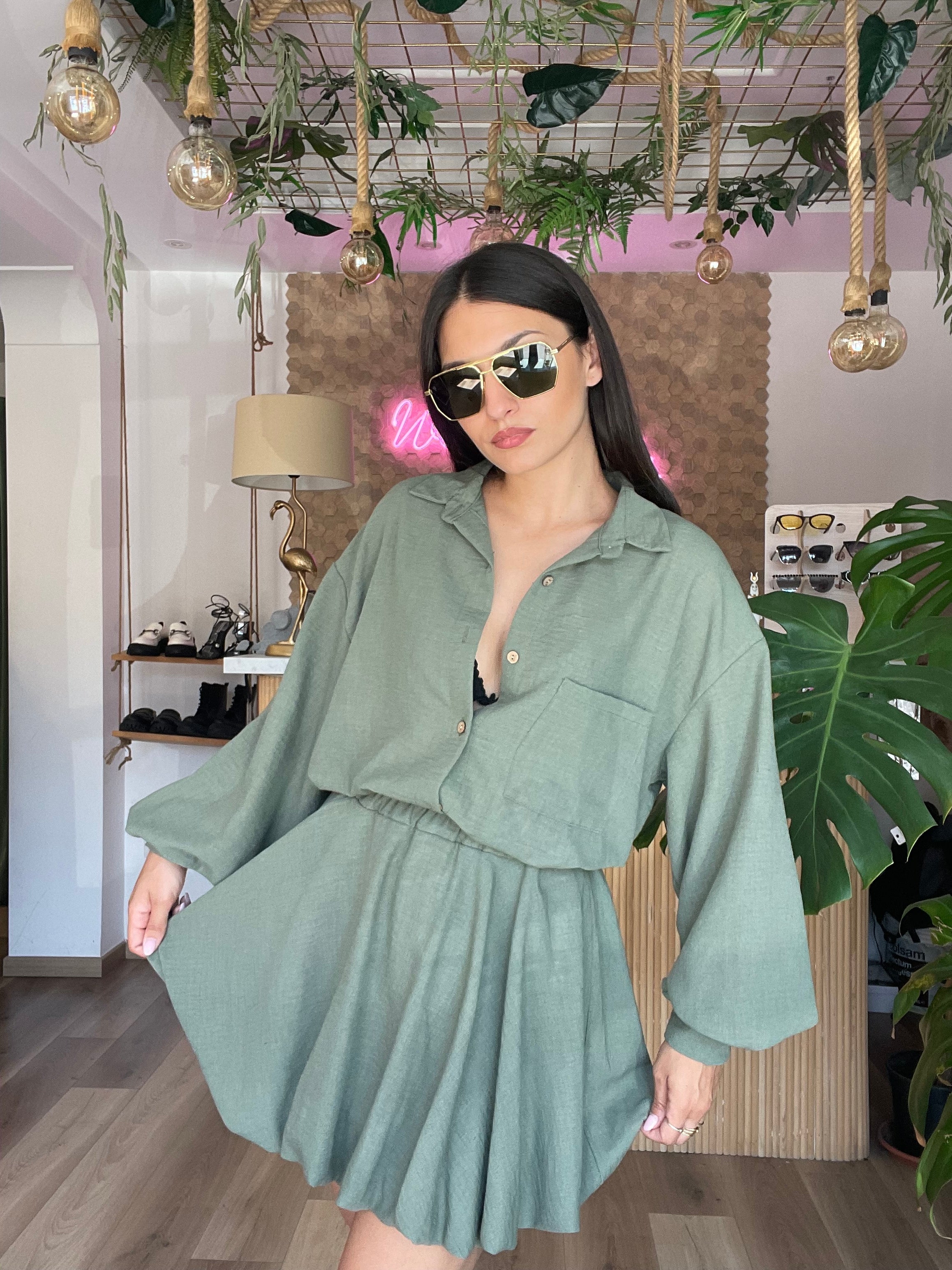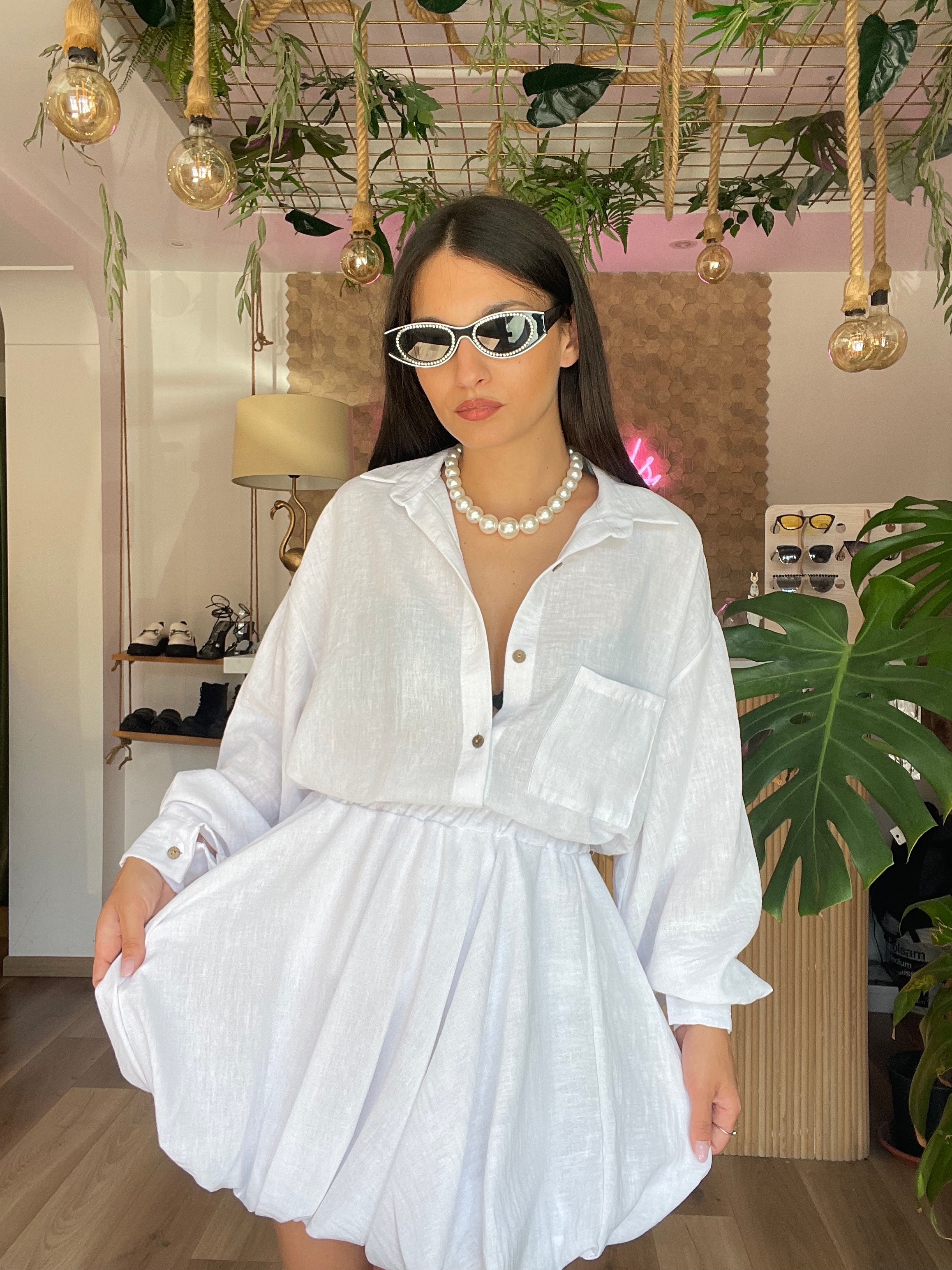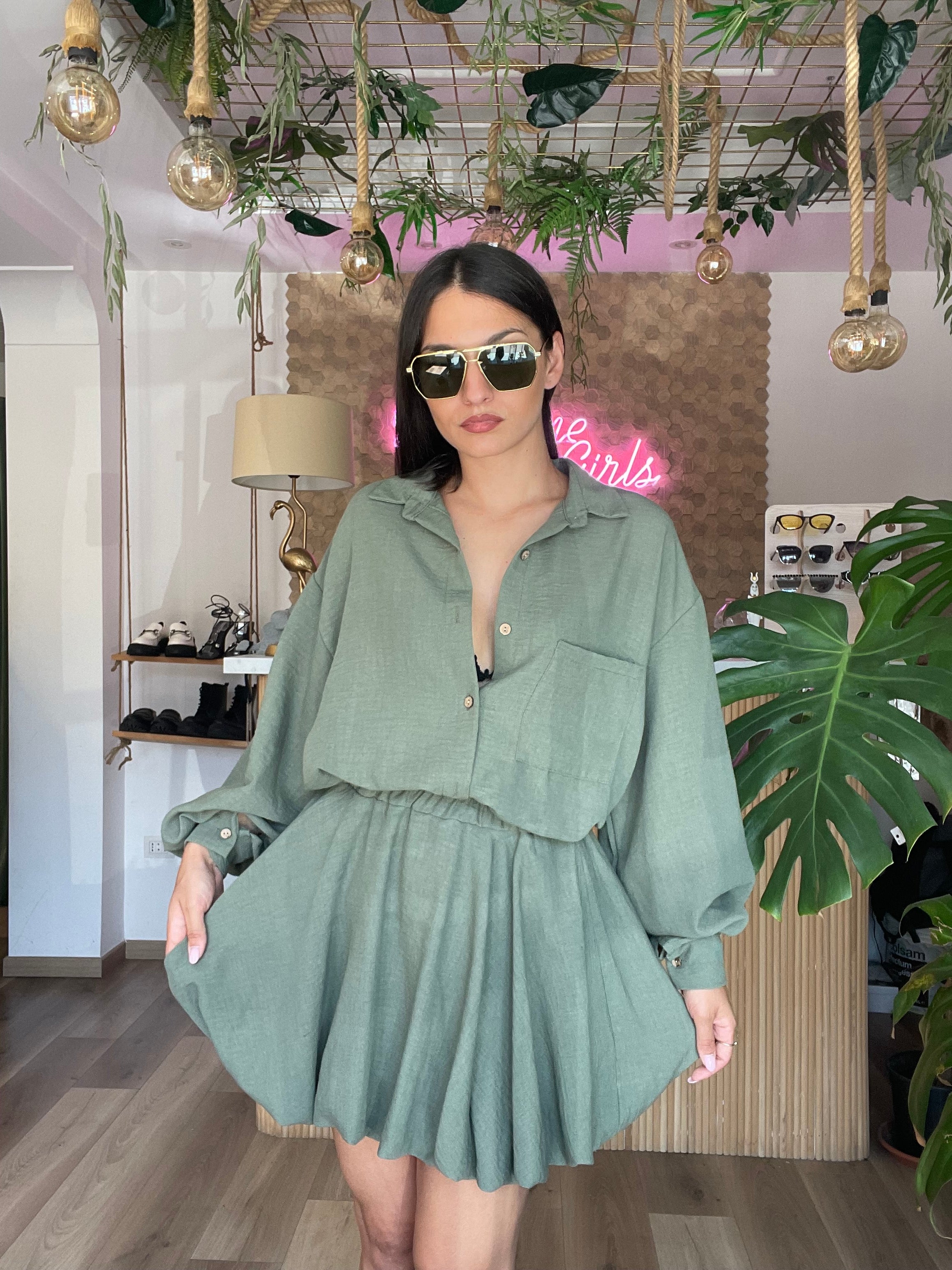 Il Cordinato Vania è perfetto per ogni occasione, grazie alla sua leggerezza e comodità. Il set comprende una camicia e una gonna baloon con elastico in vita, adattabile a taglie dalla XS alla L. Con un design unico e versatile, questo set è un must-have per il tuo guardaroba!