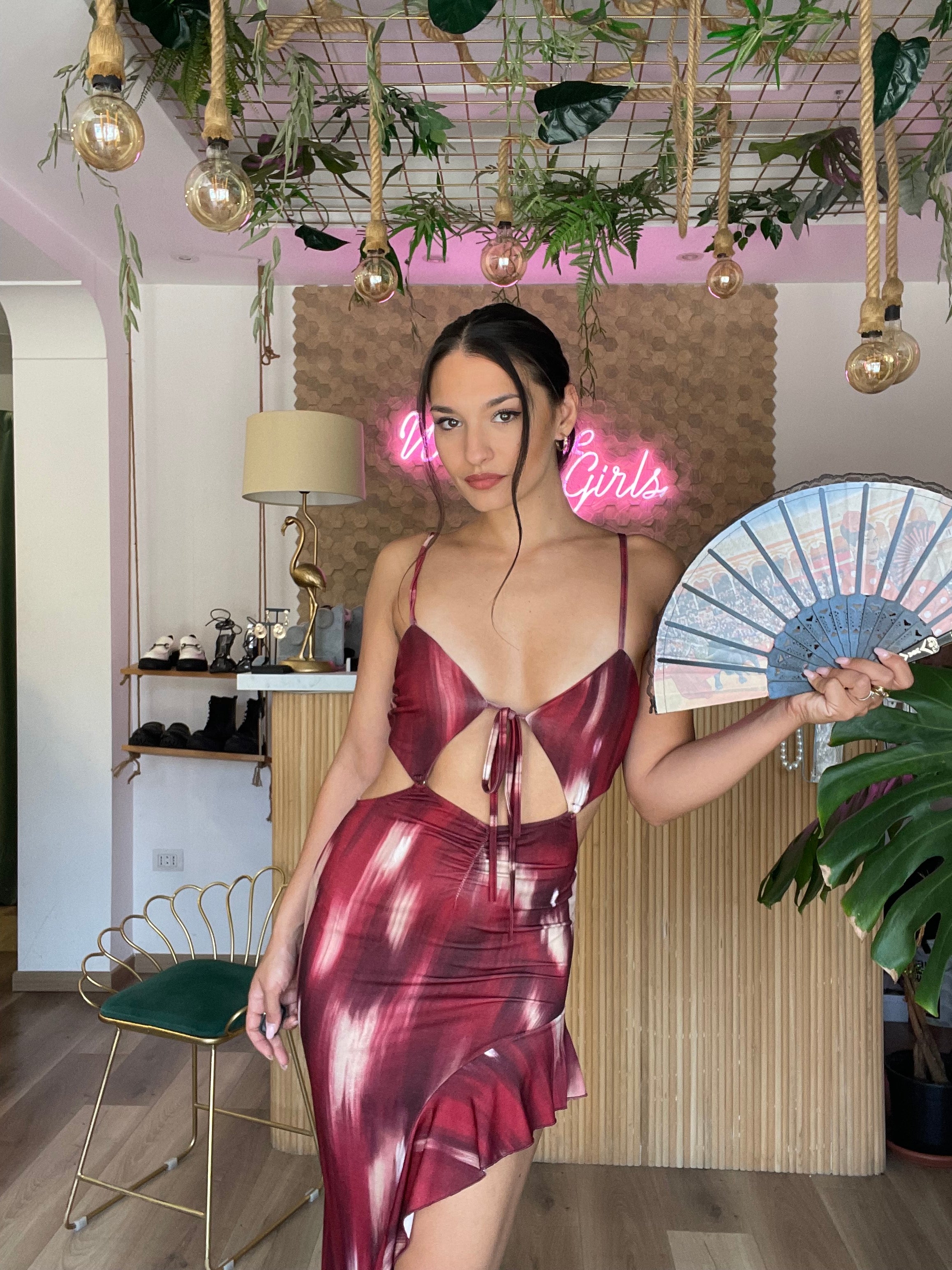 Abito lungo asimmetrico con rouches elasticizzato adatto a taglie dalla XS alla M. Vestibilità perfetta grazie alla sua elasticità. Lunghezza versatile per adattarsi alle diverse forme del corpo. Adatto per occasioni eleganti.